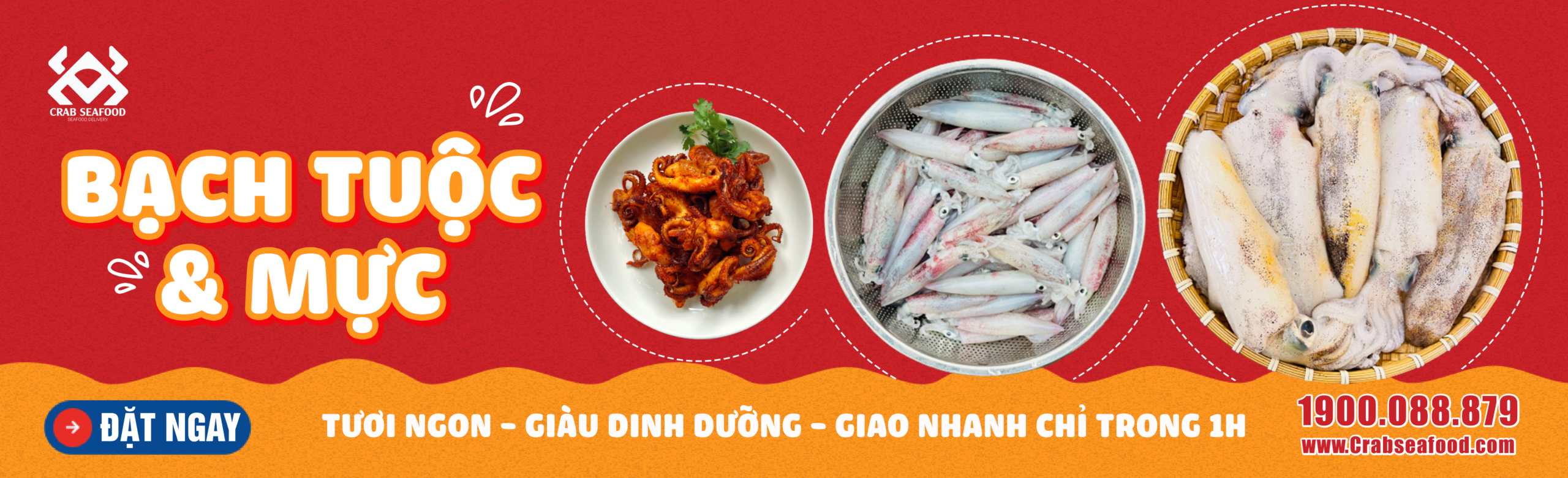 Các sản phẩm mực, bạch tuộc tươi sống được Crab Seafood vận chuyển trực tiếp từ tàu câu mực tại Vũng Tàu về TP.HCM ngay trong ngày. Sản phẩm mực tươi, bạch tuộc tươi được giao nhanh cho khách hàng trong 1 giờ, với cam kết chất lượng 1 đổi 1 cho khách hàng.
